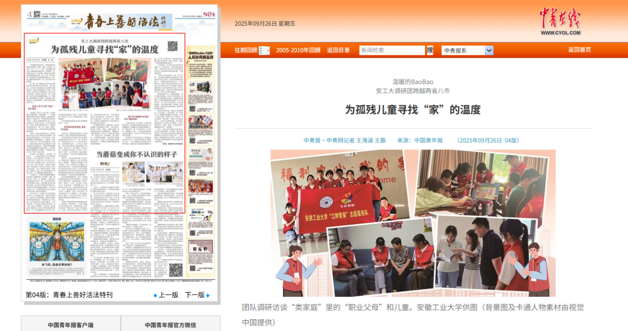 2025年9月26日,《中国青年报》在其纸质报纸第04版以《安工大调研团跨越两省八市为孤残儿童寻找“家”的温度》为题刊发对我院“类家庭”调研团的深度报道。报道系统呈现了调研团队历时两年,深入安徽、江苏两省八市,走访调研孤残儿童救助现状的实践历程与研究成果,生动展现了我院学子服务社会、关爱特殊群体的责任担当与专业精神。
